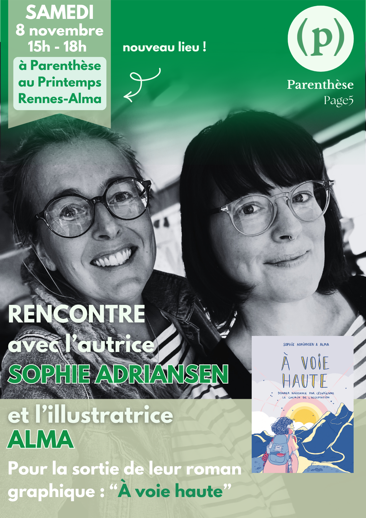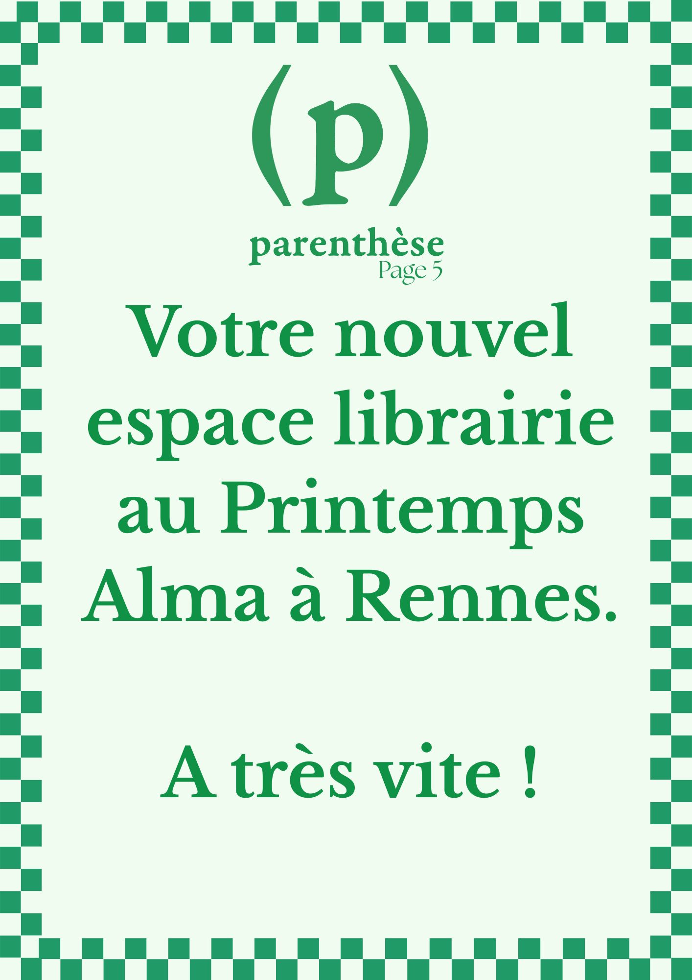 La rencontre se passera dans notre nouvel espace librairie Parenthèse au Printemps Rennes Alma de 15h à 18h.